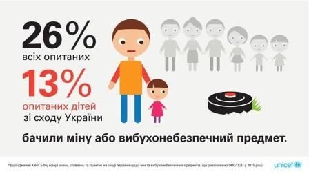 Лише від березня у Східній Україні протипіхотні міни стали причиною поранень понад ста дітей. Саме діти найбільш наражені на небезпеку – наголошує генеральний директор ЮНІСЕФ–Польща Марек Крупінський: «Уламки мін дуже часто виглядають, як щось привабливе, як іграшки і тому для дітей це безпосередня загроза. Згідно з нашими даними, у регіоні Донецька та Луганська жертвами протипіхотних мін стали понад 150 людей, у тому числі 42-оє дітей. Це трагічний баланс, бо повинно бути нуль».