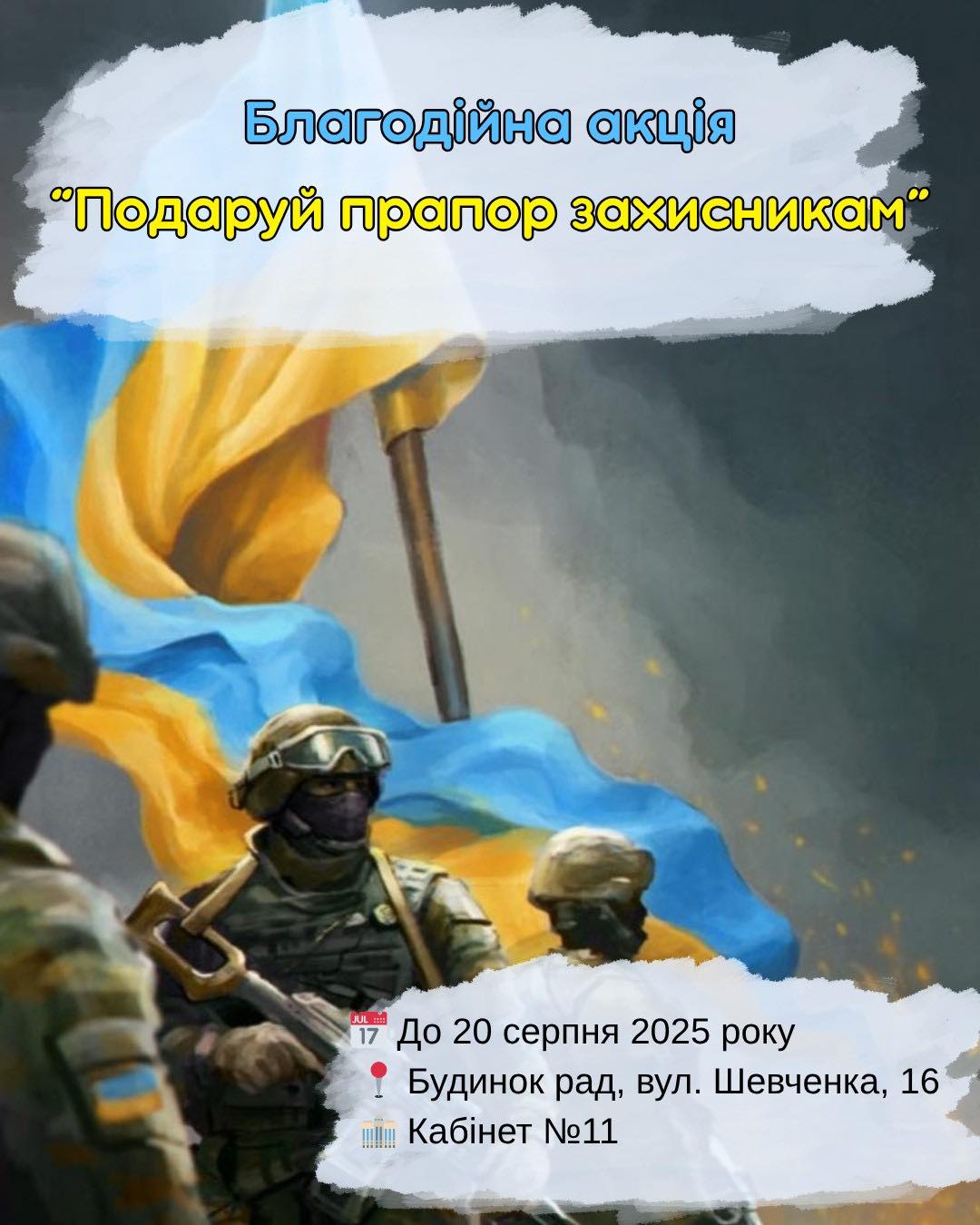Придбайте державний прапор України та до 20 серпня 2025 року передайте його до:Будинку рад (вул. Шевченка, 16), кабінет №11.
