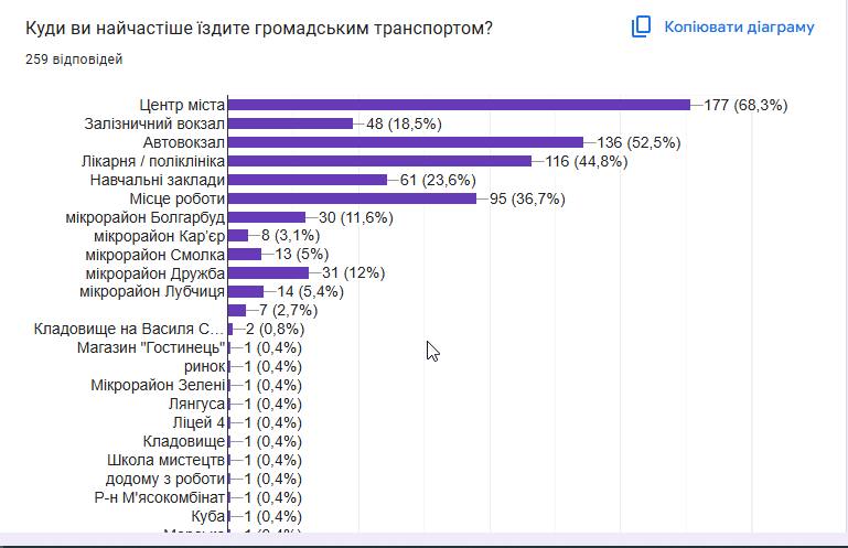 Відповіді на запитання «Куди ви найчастіше їздите громадським транспортом?» демонструють багатофункціональність маршруту.