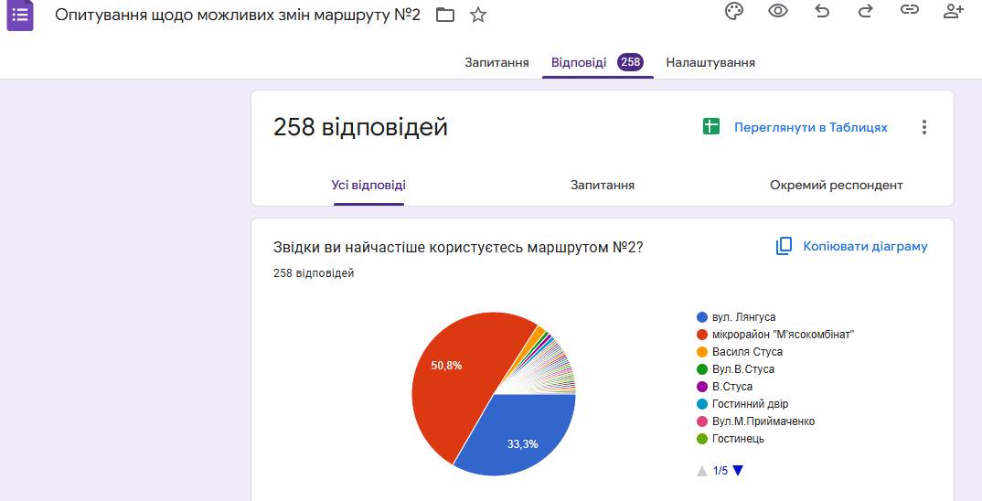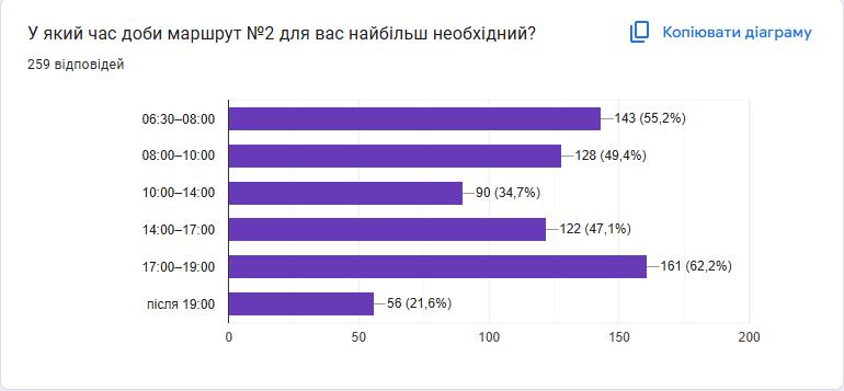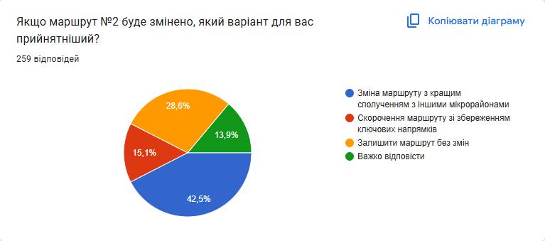 За короткий час участь в опитуванні взяли 258 респондентів, що є показовим прикладом активної громадської позиції та високої зацікавленості у темі міського транспорту.Отримані відповіді дозволяють не лише оцінити поточну роль маршруту №2, а й зрозуміти очікування мешканців щодо його подальшого функціонування.
