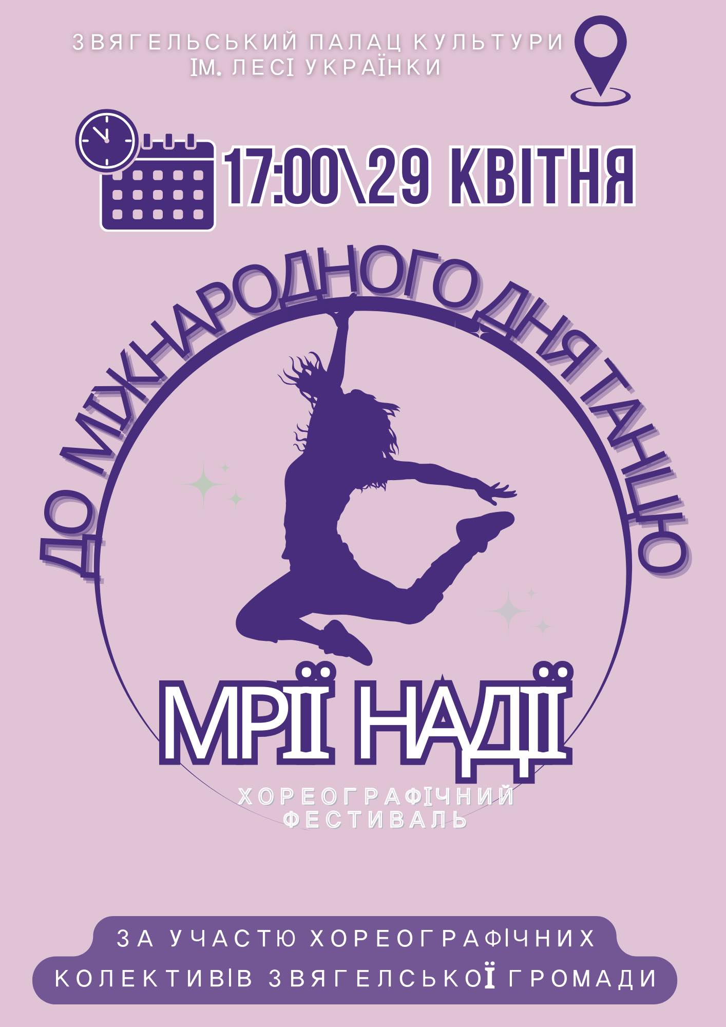 29 квітня 2025 року о 17:00 у Палаці культури імені Лесі Українки м. Звягель відбудеться хореографічний фестиваль «Мрії надії», приурочений до Міжнародного дня танцю.