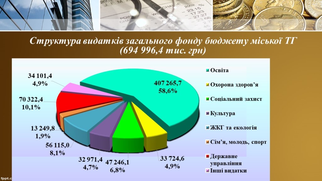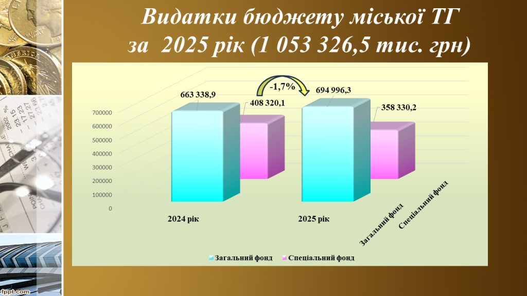 Касові видатки за загальним фондом становлять 694млн. 996,4 тис. грн, або 96,4%, що більше на 31млн. 657,5 тис. грн. або 4,8% 2024 року.