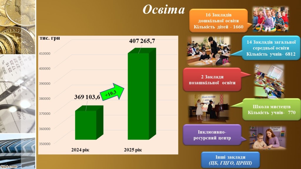 Пріоритетним завданням галузі Освіта, в умовах продовження воєнного стану та збройної агресії є надання освітніх послуг дітям, забезпечивши при цьому безпеку всім учасникам освітнього процесу. У 2025 році в галузі функціонували: