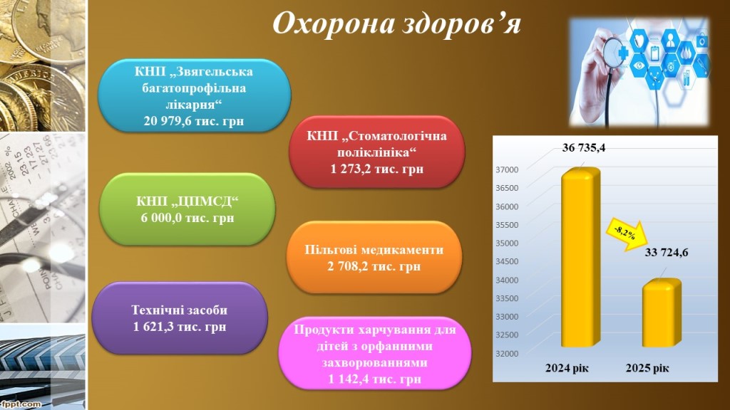 У 2025 році на галузь Охорона здоров’я, відповідно до затверджених програм розвитку та фінансової підтримки комунальних некомерційних підприємств за загальним фондом спрямовано 33 млн.724,6 тис. грн., що на 3 млн.010,8 тис.грн або 8,2% менше видатків 2024 року. З бюджетів інших територіальних громад спрямовано 601,8 тис. грн. (Брониківської, Піщівської, Стриївської, Ярунської).
