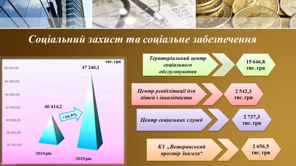 – Територіального центру соціального обслуговування (надання соціальних послуг) 15млн. 646,8 тис. грн, що на 333,5 тис.грн або 2,2% більше видатків 2024 року;