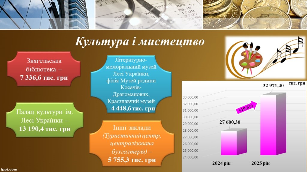 На забезпечення діяльності КЗ „Звягельська бібліотека“ спрямовано 7млн. 336,6 тис. грн, що більше видатків 2024 року на 836,0 тис. грн або 12,9%, на функціонування літературно – меморіального музею Лесі Українки та філії музею родини Косачів-Драгоманових, Звягельського Краєзнавчого музею спрямовано 4млн. 448,6 тис. грн, що у порівнянні з 2024 роком більше на 9% або 368,3 тис. грн.