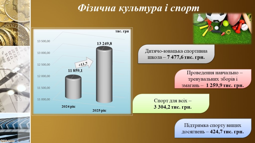 Всебічне виховання та становлення здорової нації, удосконалення фізичних здібностей є головними функціями галузі „Фізична культура і спорт“. На функціонування установ галузі у 2025 році за загальним фондом використано 13млн. 249,8 тис. грн, що на 11,7 % або 1млн. 390,7 тис.грн більше видатків 2024 року.