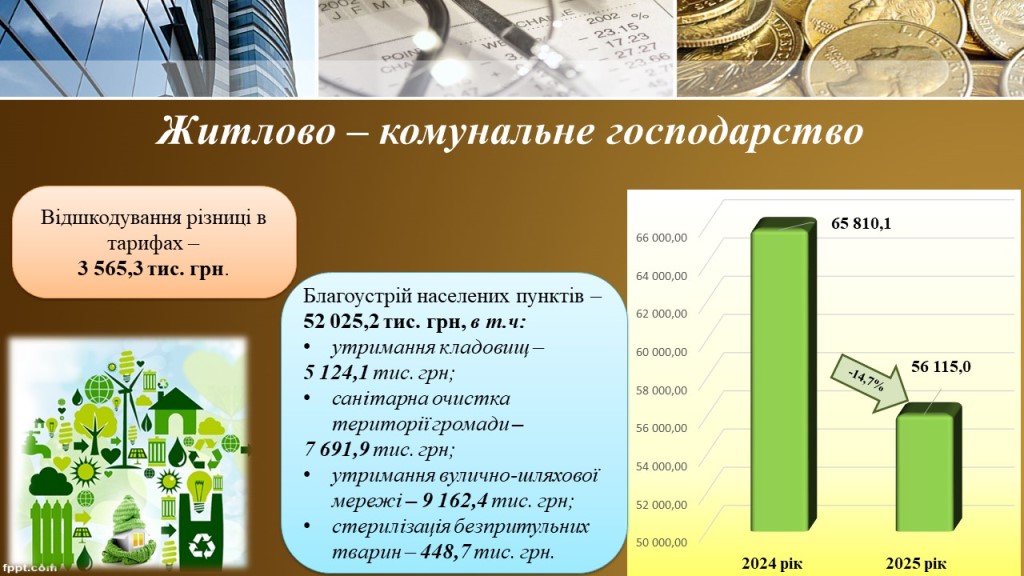 Житлово – комунальне господарство – одна із найважливіших галузей громади. Комунальне господарство, а насамперед сфера благоустрою міста, забезпечує необхідні умови для функціонування та задоволення суспільних потреб громади. У 2025 році видатки галузі житлово-комунального господарства становили 56млн. 115,0 тис.грн, що на 17,3 % або на 9млн. 695,1 тис.грн. менше видатків 2024 року.