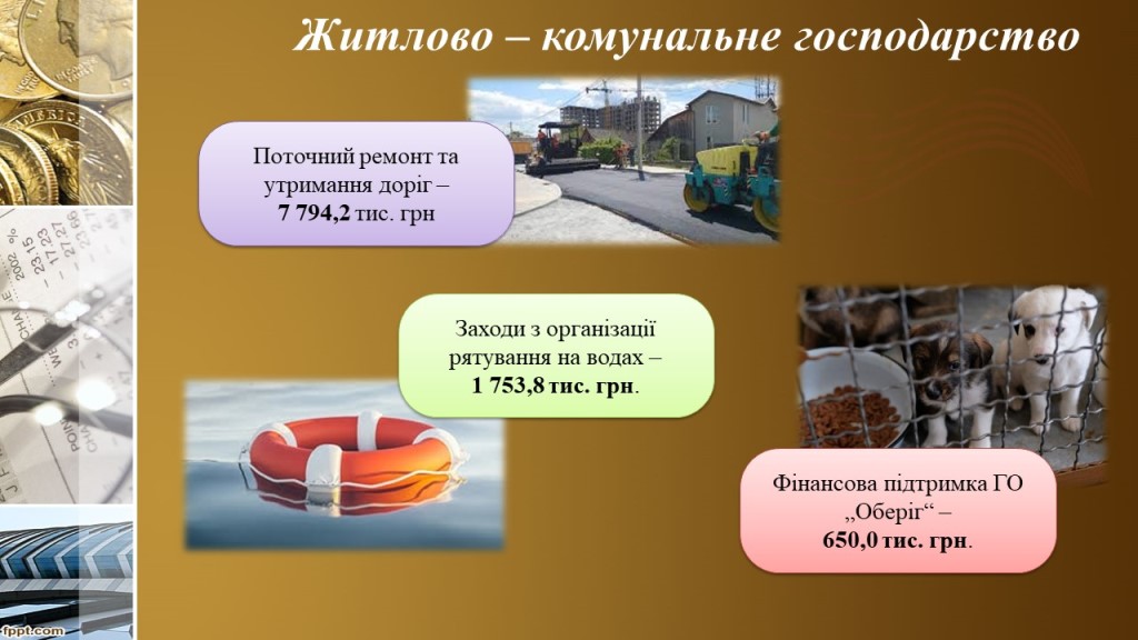 Крім того 7млн. 794,2 тис.грн коштів загального фонду були спрямовані на поточний ремонт та утримання доріг міської територіальної громади, що на 2млн. 150,1 тис.грн менше ніж у 2024 році. та на фінансову підтримку громадської організації «Оберіг» спрямовано – 650,0 тис.грн.