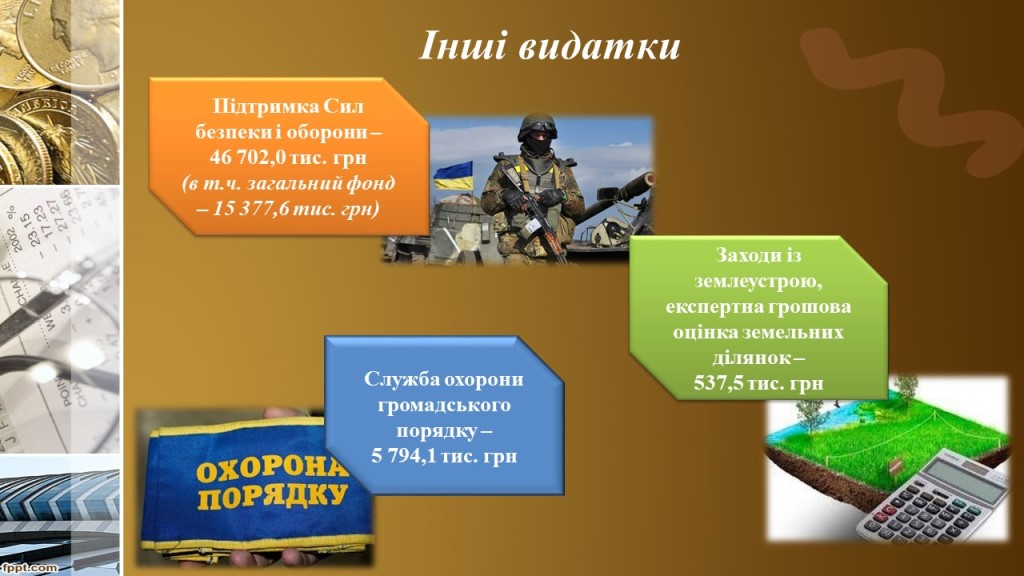 На підтримку Збройних Сил України та інших силових структур з бюджету міської ТГ спрямовано 46,7 млн. грн. На виконання гарантійних зобов’язань перед Міжнародним банком реконструкції та розвитку ТГ спрямовано 14млн. 717,0 тис. грн.