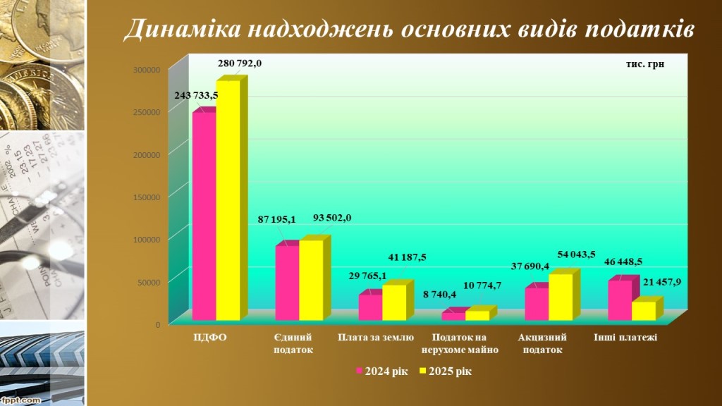 Порівняно з 2024 роком надходження зросли на 32млн. 575,5 тис. грн, або на 14,9 %. Питома вага ПДФО із заробітної плати, що сплачується податковими агентами, у загальній структурі податку становить 89,7 %.