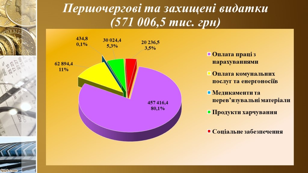 Протягом звітного періоду в першу чергу забезпечувалось фінансування першочергових та захищених видатків, на ці цілі спрямовано 571млн. 006,5 тис. грн або 82,2 %, що більше 2024 року на 48,5 млн.грн.