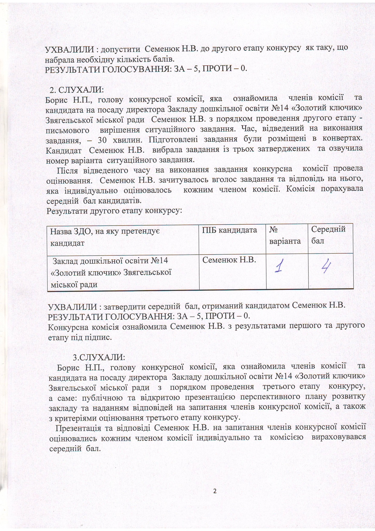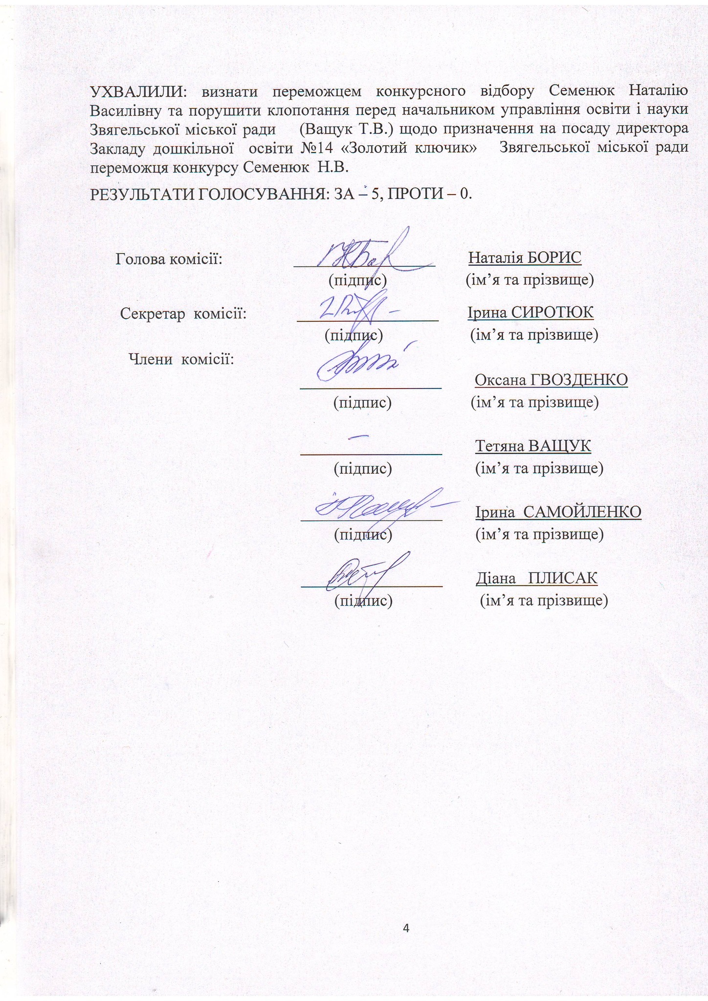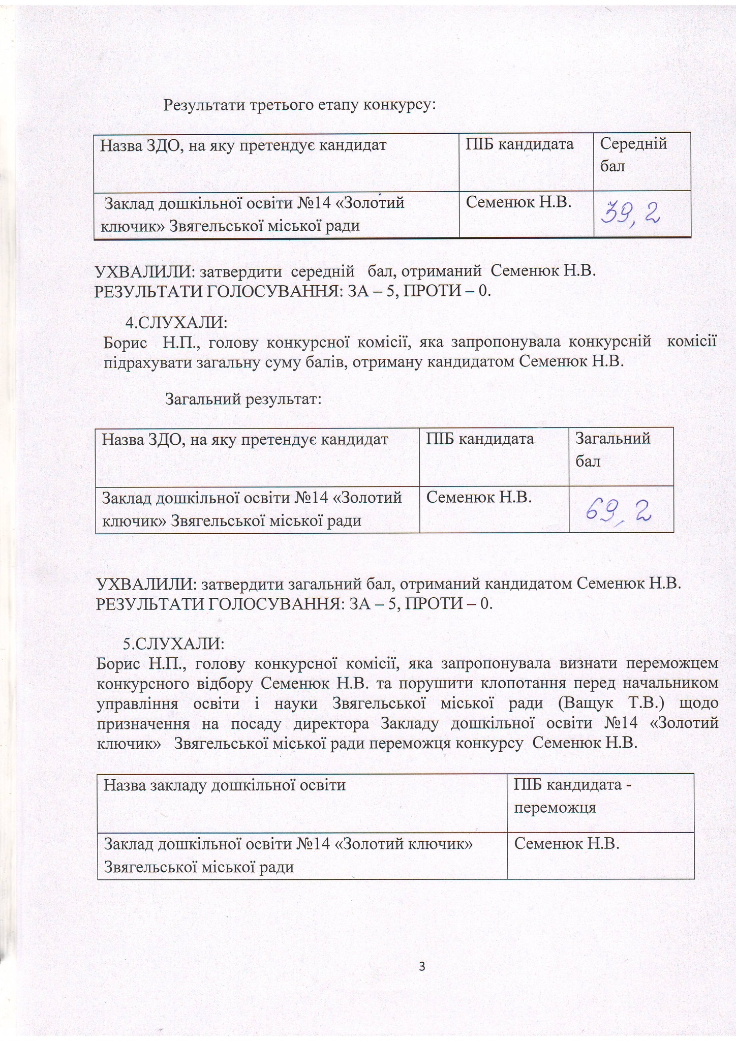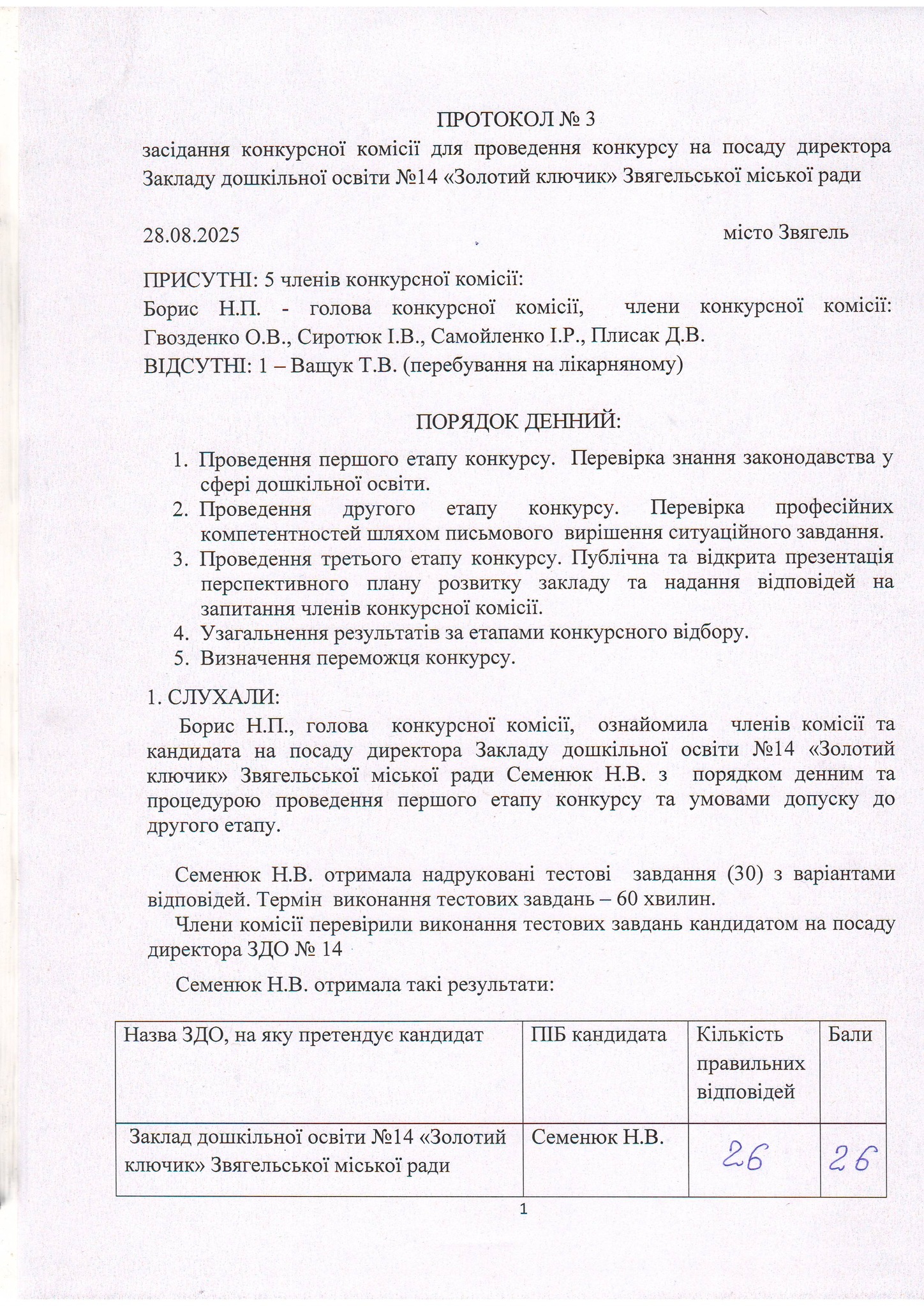 Комісія рекомендувала начальнику управління освіти і науки Звягельської міської ради Ващук Т.В. призначити на посаду директора Закладу дошкільної освіти №14 «Золотий ключик» Звягельської міської ради переможця конкурсу Семенюк Наталію Василівну шляхом укладення строкового трудового договору (протокол №3 від 28.08.2025 додається).