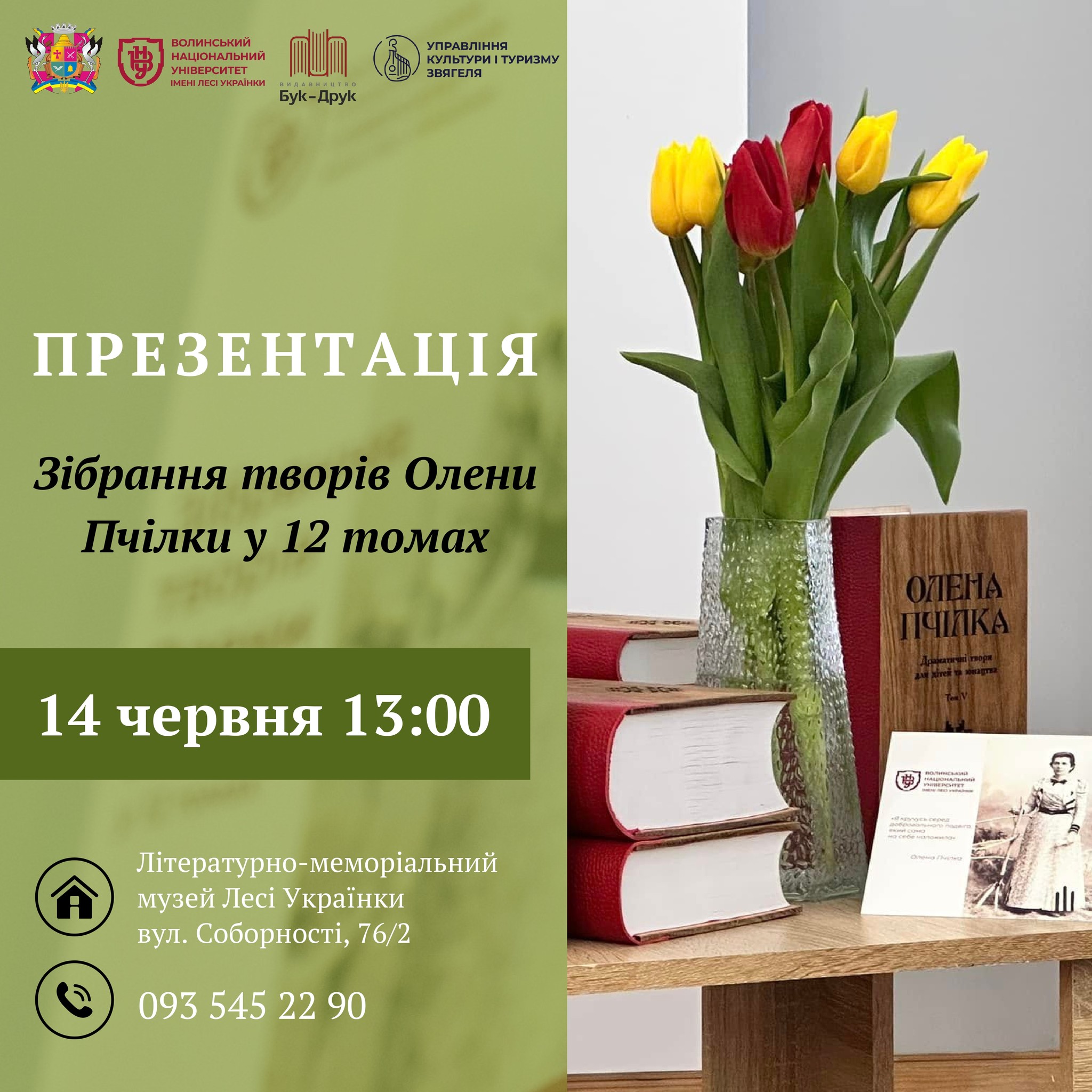 У суботу, 14 червня, у Літературно-меморіальному музеї Лесі Українки спільно з Волинським національним університетом імені Лесі Українки і видавництвом “Бук-Друк” презентуватимуть перше унікальне видання творів Олени Пчілки у 12 томах.