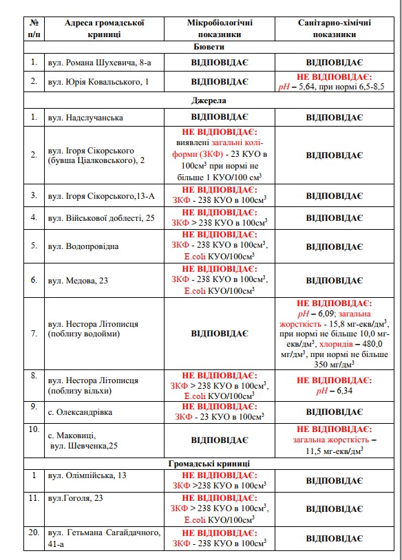 Мікробіологічні та санітарно-хімічні показники бюветів, джерел та громадських криниць Звягеля