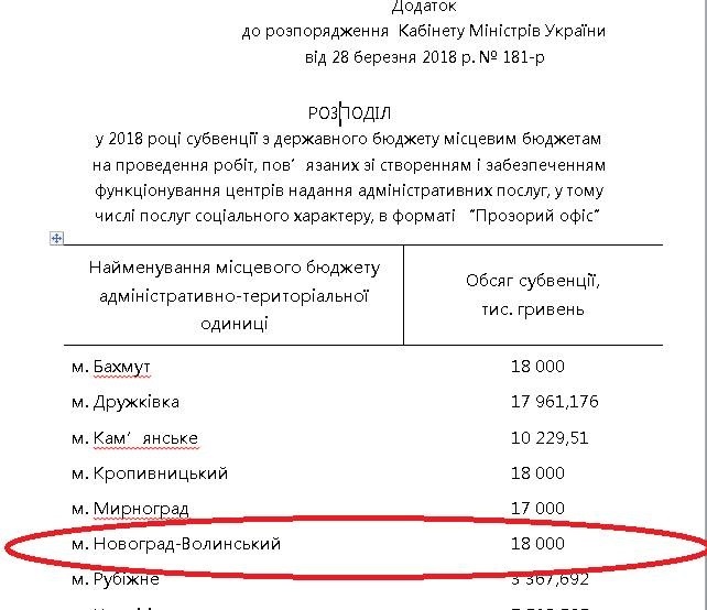Це дасть змогу створити та забезпечити функціонування зазначених центрів у 8 містах та 8 об’єднаних територіальних громадах різних регіонів України. До цього переліку, завдяки зусиллям та наполегливій роботі міського голови Віктора Весельського з Міністром соціальної політики України Андрієм Ревою, ввійшло місто Новоград-Волинський. На будівництво центру надання адміністративних послуг у форматі «Прозорий офіс» Новоград-Волинський отримає субвенцію з державного бюджету у розмірі 18 млн. грн. згідно розпорядження Кабінету Міністрів України № 181-р від 28 березня 2018 року. Будівництво «Прозорого офісу» у новограді-Волинському буде розпочато вже у 2018 році.