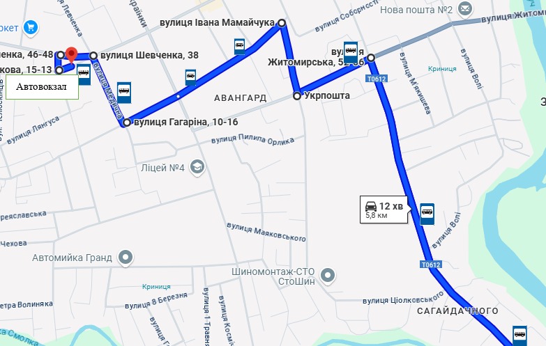 Починаючи із зупинки на вул. Житомирській, автобуси курсуватимуть за маршрутом: