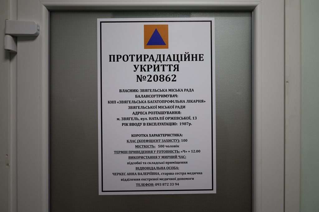 У лікувальному корпусі КНП «Звягельська багатопрофільна лікарня» завершено капітальний ремонт протирадіаційного укриття. Після отримання всіх необхідних дозвільних документів об’єкт офіційно введено в експлуатацію. Укриття розраховане на одночасне перебування до 500 осіб та відповідає встановленим вимогам безпеки.