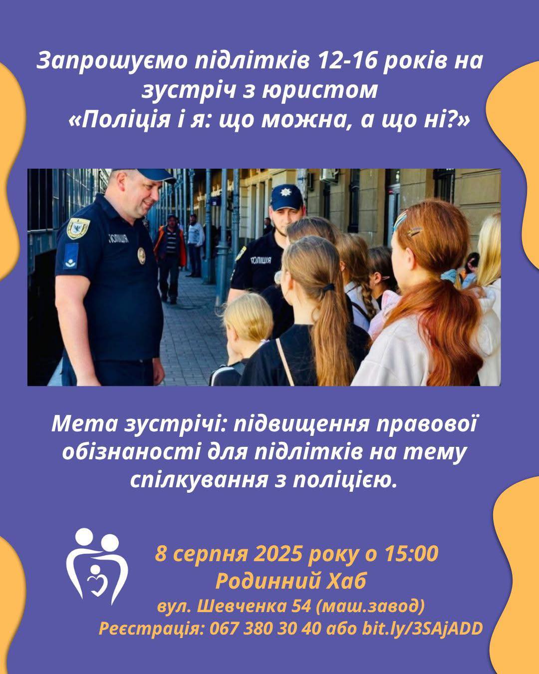 – На зустрічі з юристом учасники дізнаються про свої права, правила спілкування з представниками поліції та корисні юридичні поради для підлітків у повсякденному житті.