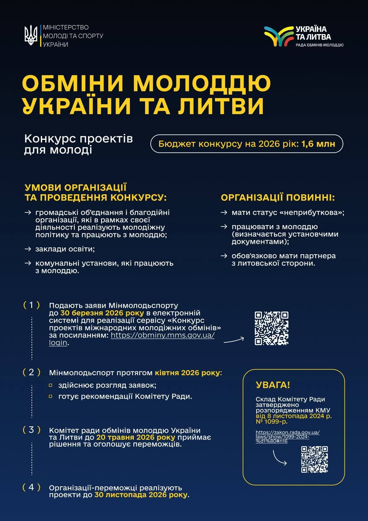 Стартував конкурс проєктів молодіжних обмінів України та Литви на 2026 рік!