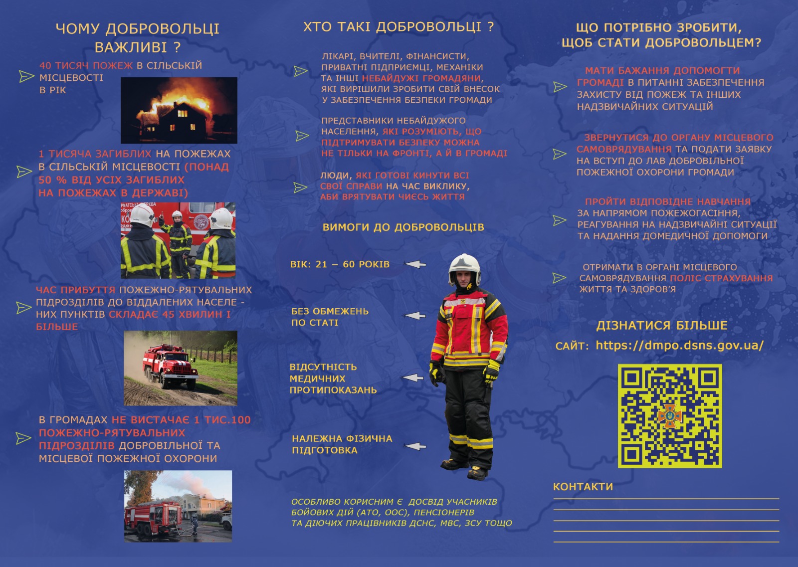 Добровольці — це перші помічники професійних пожежних, які реагують на пожежі та надзвичайні ситуації, що виникають на території їх громади. Перш за все – це небайдужі громадяни, які вирішили зробити свій внесок у забезпечення безпеки громади. Люди, які готові кинути всі свої справи на час виклику, аби врятувати чиєсь життя.