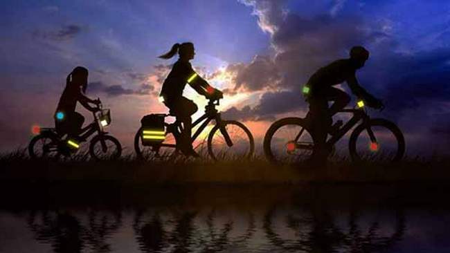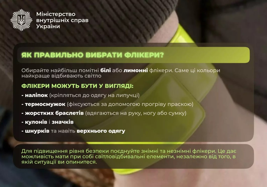 Подбайте про безпеку дітей і власну: використовуйте світловідбиваючі елементи на одязі, рюкзаках, сумках, велосипедах і самокатах.