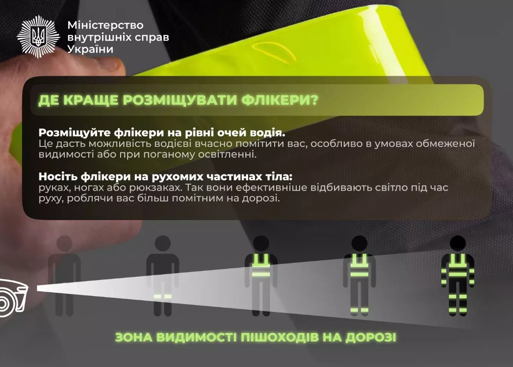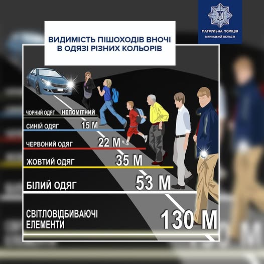 У темну пору доби, за несприятливих зимових погодних умов та обмеженої видимості пішоходи зобов’язані використовувати світлоповертальні елементи або одяг зі світловідбиваючими вставками (п. 4.4 ПДР України).