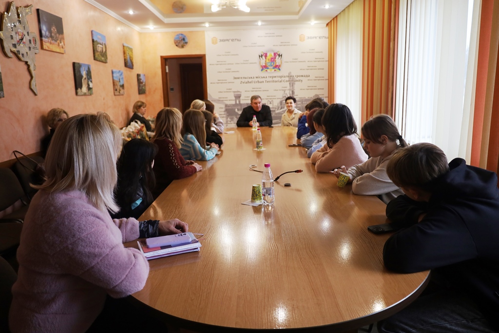 Сьогодні у конференц-залі Будинку рад відбулася зустріч-спілкування міського голови Миколи Боровця з дітьми з Чугуївської громади Харківської області, які перебувають у місті Звягель у межах експериментального проєкту «Пліч-о-пліч: згуртовані громади».