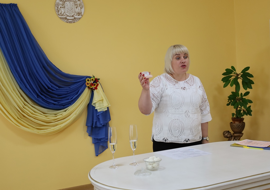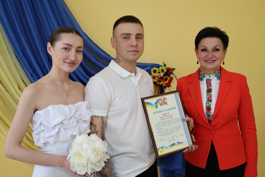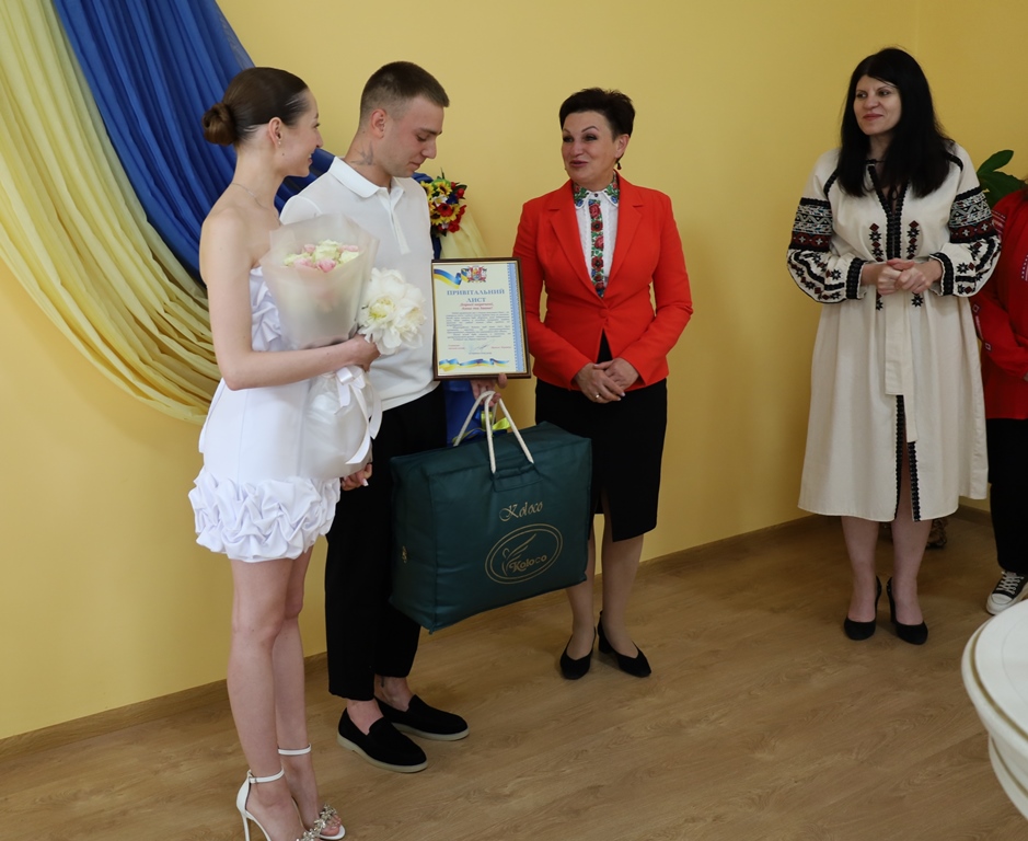 З цієї нагоди представники Звягельської міської ради – заступник міського голови Наталія Борис, а також заступник начальника управління сім’ї, молоді, фізичної культури та спорту Оксана Мостович та головний спеціаліст Анастасія Кіщенко – привітали новостворену родину Анни та Івана, які одружилися цього дня. Їм вручили привітальний лист від міського голови Миколи Боровця та символічний подарунок.