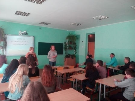 В рамках тижня правових знань «Закон у моєму житті», з метою активізації правоосвітницької діяльності та поширення правових знань серед населення та молоді міста, заступником директора-начальником відділу соціальної роботи МЦСССДМ Оленою Котовою спільно з начальником відділу правопросвітництва та взаємодії із суб’єктами надання БВП Іриною Колесник та студентами 3,4 курсів Новоград-Волинського економіко-гуманітарного коледжу, відділення «Правознавство», організовано та проведено зустрічі з учнями 9 класів ЗОШ І-ІІІ ступенів № 2 та 5, КНЗ «Новоград-Волинської загальноосвітньої школи-інтернат І-ІІ ступенів Житомирської обласної ради». Студентами Новоград-Волинського економіко-гуманітарного коледжу підготовлено, презентовано та обговорено актуальну тему «Права та відповідальність неповнолітніх». Також учні мали змогу переглянути відеоролики «Злочини», «Адміністративна відповідальність неповнолітніх», «Кримінальна відповідальність неповнолітніх». З проявами булінгу в Україні стикаються 8 із 10 дітей. Такі дані оприлюднили в Українському інституті дослідження екстремізму. Таке явище, як шкільне цькування однолітків, поширюється по всьому світу, бо насильницька модель поведінки стає дедалі популярнішою. До чого може призвести ігнорування булінгу, як його попередити та чому поліція не завжди може допомогти?»- ці та інші питання з учнями обговорили організатори заходу. Загалом зустрічі пройшли в дружній атмосфері.