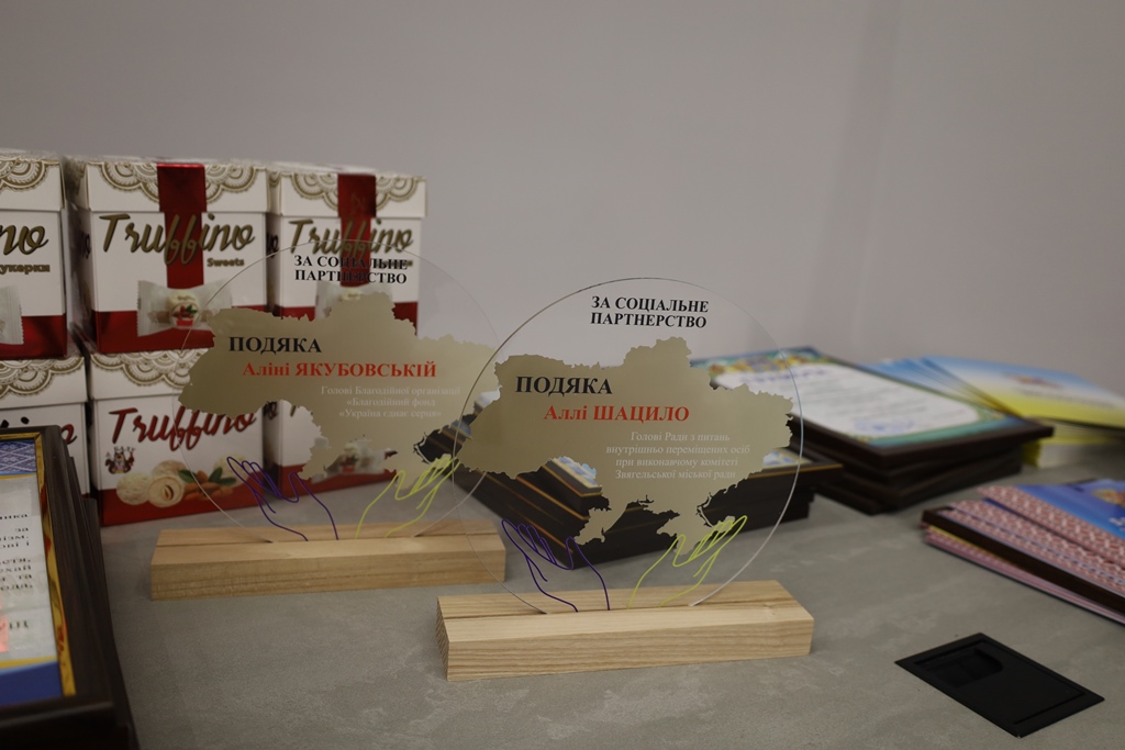 Начальниця управління соціального захисту населення Лілія Хрущ вручила Подяки «За соціальне партнерство» Шацило Аллі, голові Ради з питань внутрішньо переміщених осіб при виконкомі, та Якубовській Аліні, голові Благодійного фонду «Україна єднає серця».