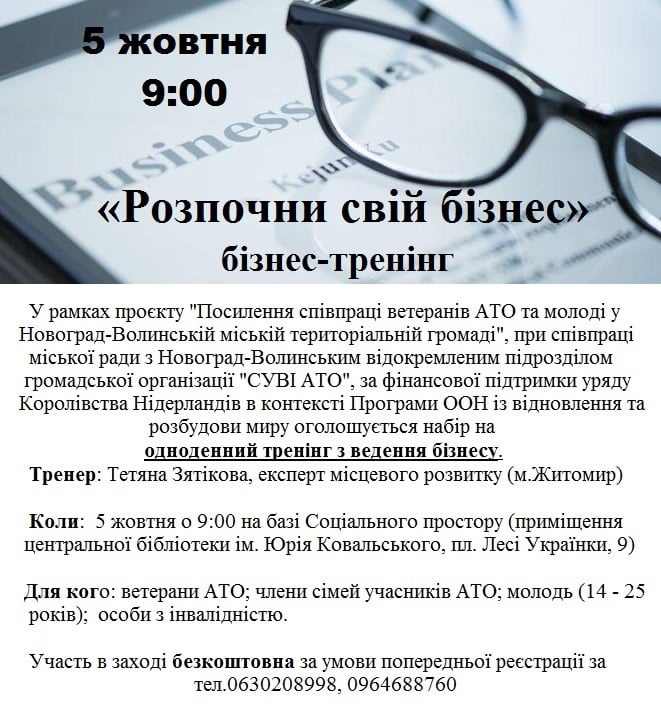 У рамках проєкту «Посилення співпраці ветеранів АТО та молоді у Новоград-Волинській міській територіальній громаді», при співпраці міської ради з Новоград-Волинським відокремленим підрозділом громадської організації «СУВІ АТО», за фінансової підтримки уряду Королівства Нідерландів в контексті Програми ООН із відновлення та розбудови миру оголошується набір на одноденний тренінг з ведення бізнесу.