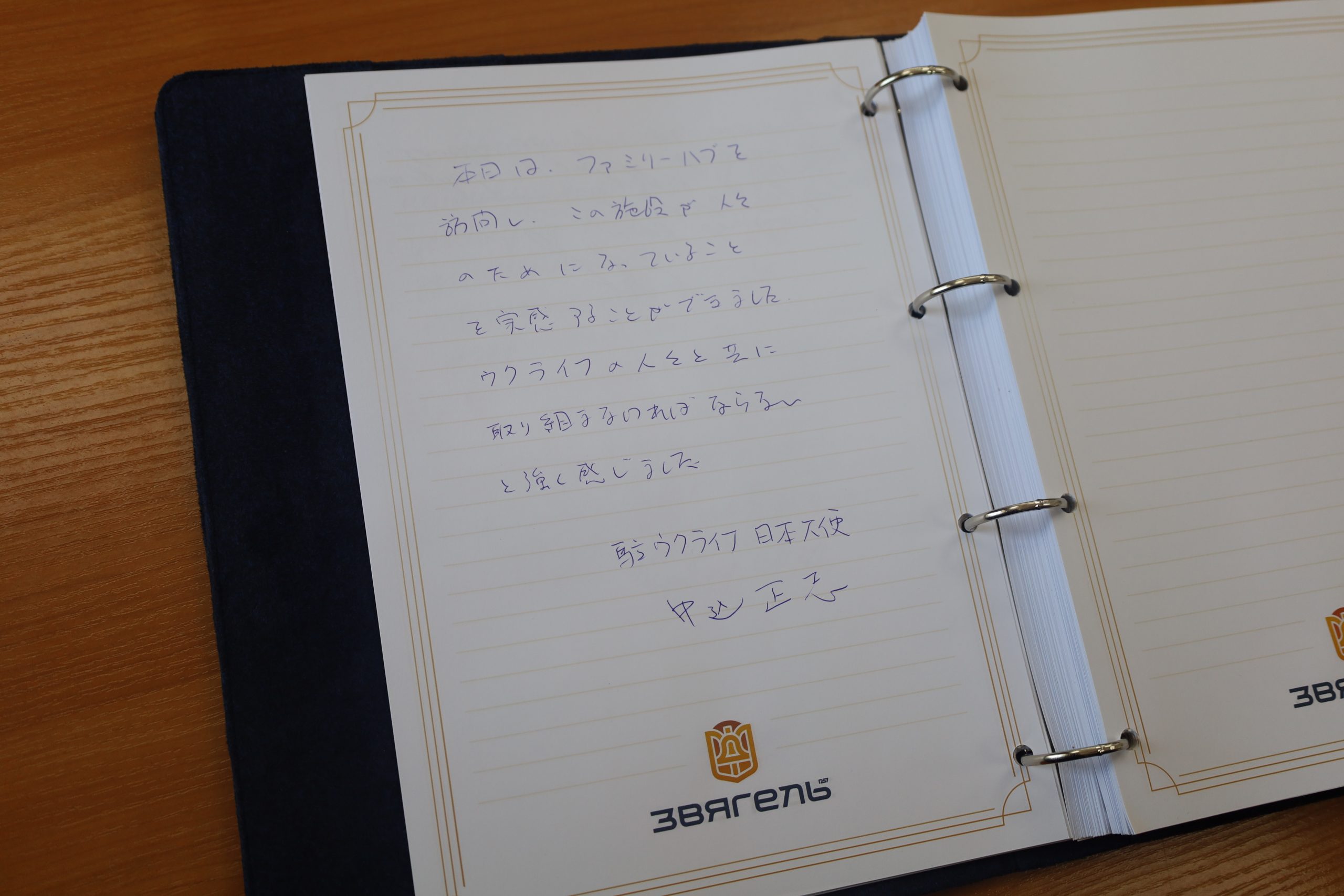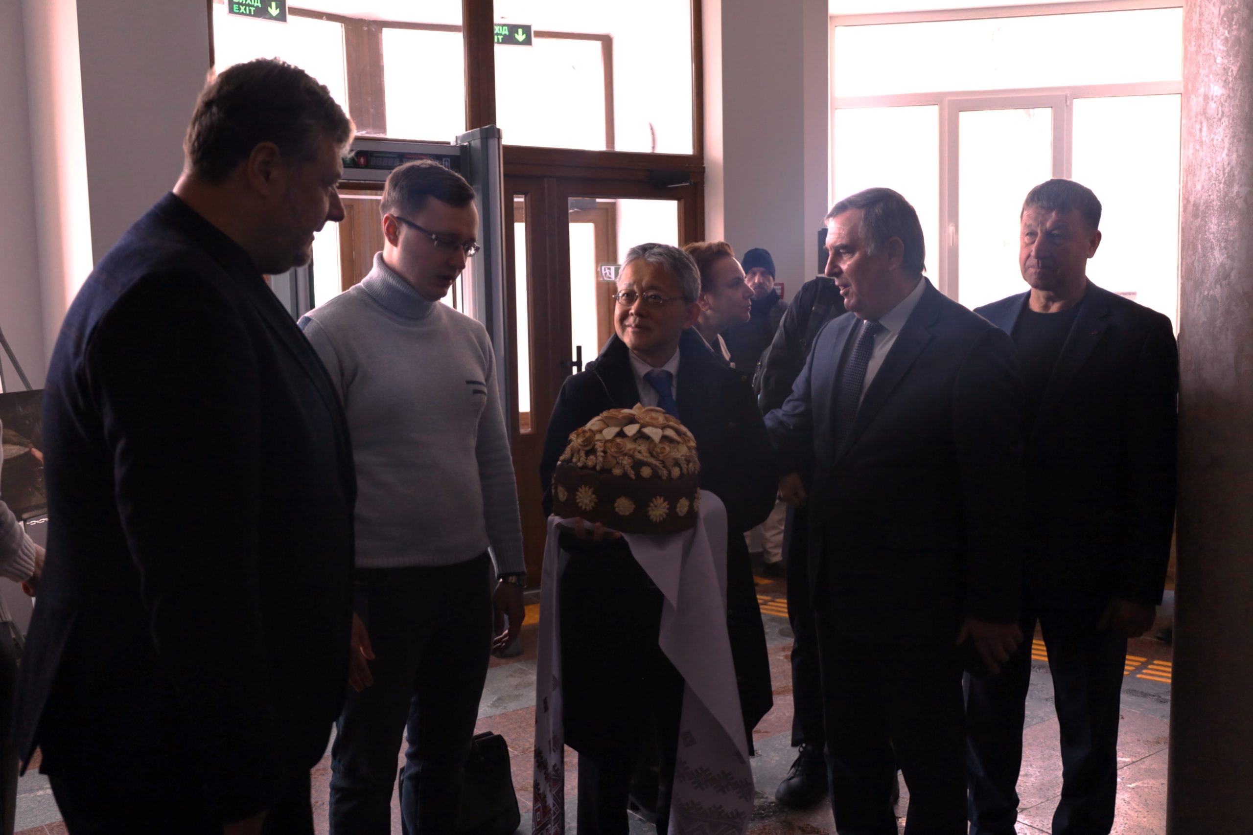 На знак вдячності гостям вручили український коровай, а пан Посол залишив запис у Почесній книзі гостей Звягеля, засвідчивши солідарність японського народу з Україною.