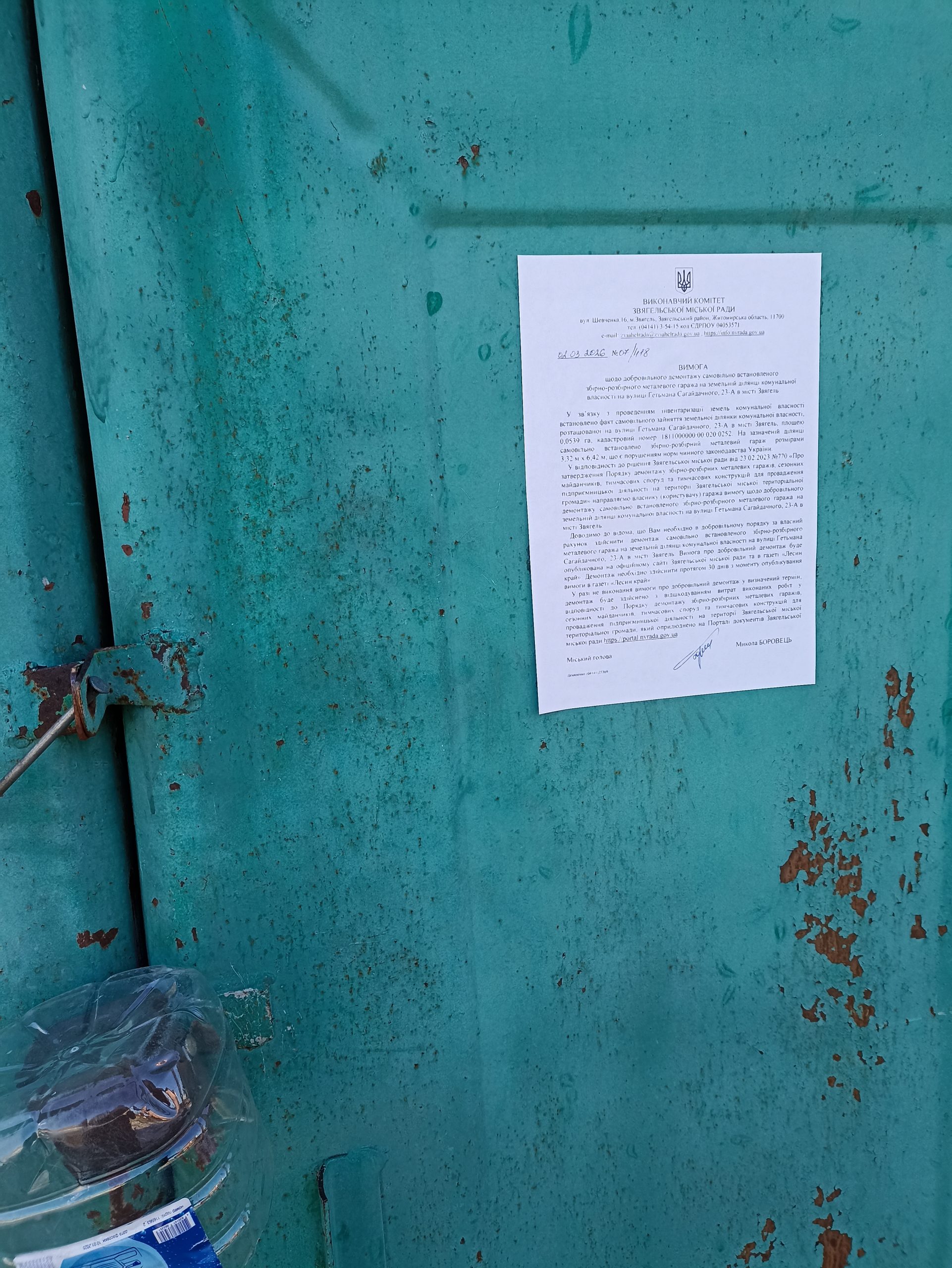 Повідомляємо власника (користувача) гаража про необхідність в добровільному порядку за власний рахунок протягом 30 днів з моменту опублікування Вимоги здійснити демонтаж самовільно встановленого збірно-розбірного металевого гаража на земельній ділянці комунальної власності на вулиці Гетьмана Сагайдачного, 23-А в місті Звягель.