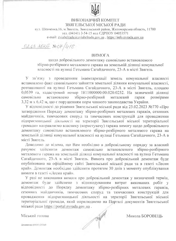 У відповідності до рішення Звягельської міської ради від 23.02.2023 №770 «Про затвердження Порядку демонтажу збірно-розбірних металевих гаражів, сезонних майданчиків, тимчасових споруд та тимчасових конструкцій для провадження підприємницької діяльності на території Звягельської міської територіальної громади» доводимо до відома власника (користувача) гаража про Вимогу щодо добровільного демонтажу самовільно встановленого збірно-розбірного металевого гаража на земельній ділянці комунальної власності на вулиці Гетьмана Сагайдачного, 23-А в місті Звягель.