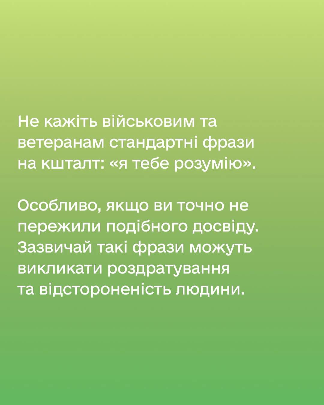 Не кажіть військовим та ветеранам стандартні фрази на кшталт: «я тебе розумію». Особливо, якщо ви точно не пережили подібного досвіду. Зазвичай такі фрази можуть викликати роздратування та відстороненість людини.