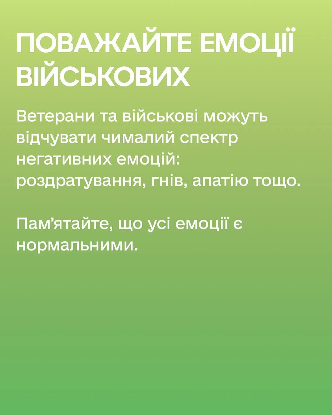 Ветерани та військові можуть відчувати чималий спектр негативних емоцій: роздратування, гнів, апатію тощо. Памʼятайте, що усі емоції є нормальними.
