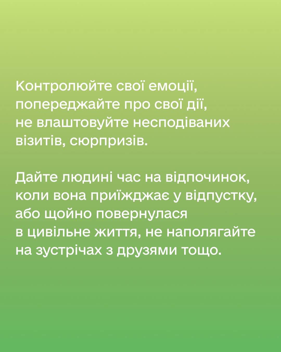 Контролюйте свої емоції, попереджайте про свої дії, не влаштовуйте несподіваних візитів, сюрпризів. Дайте людині час на відпочинок, коли вона приїжджає у відпустку, або щойно повернулася в цивільне життя, не наполягайте на зустрічах з друзями тощо.