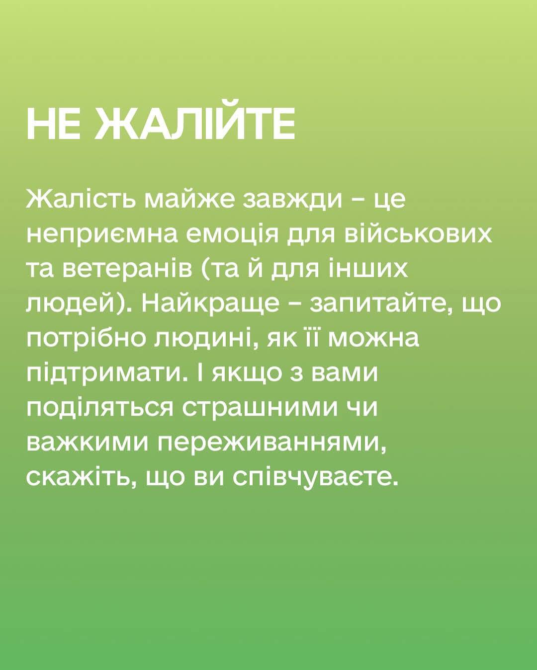 Жалість майже завжди – це неприємна емоція для військових та ветеранів (та й для інших людей). Найкраще – запитайте, що потрібно людині, як її можна підтримати. І якщо з вами поділяться страшними чи важкими переживаннями, скажіть, що ви співчуваєте.
