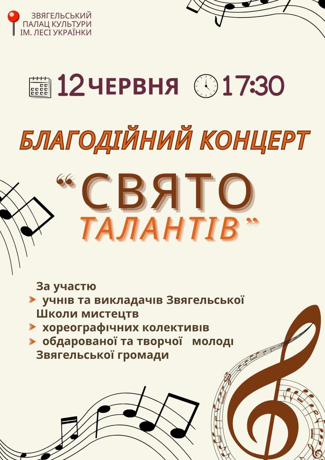 12 червня о 17:30 у Звягельському Палаці культури імені Лесі Українки відбудеться благодійний концерт Свято талантів, який об’єднає найкращі мистецькі сили громади.