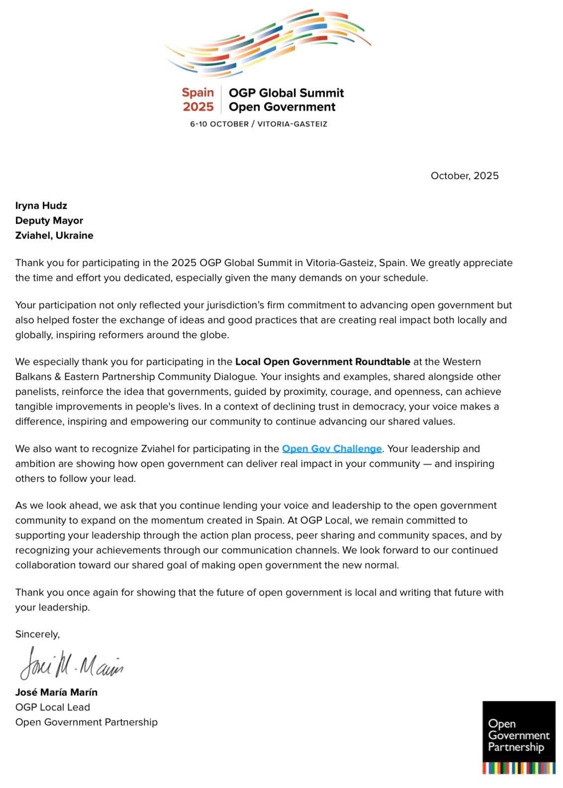 Звягельська міська рада отримала лист-подяку від міжнародної ініціативи Open Government Partnership (OGP) — за активну участь у Глобальному саміті «Партнерство «Відкритий уряд» (OGP Global Summit 2025), який відбувся у місті Віторія-Гастейс, Іспанія.